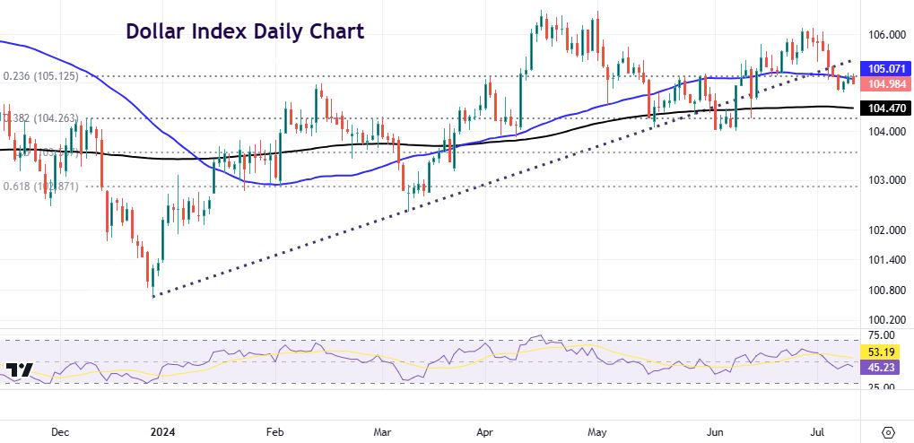 The dollar sold off last week on weak data. Downside risks in the US economy appear to be intensifying with the best lead indicators for changes in the economic cycle signalling a soft landing. There are roughly 50bps of policy easing priced in for this year, so much will depend on if the report comes in cooler. Many expect that to happen, raising the pressure on the Fed to act, with four FOMC meetings remaining in 2024. There’s a minor fib level at 105.12 with next support below at the 200-day SMA at 104.47 and then a major Fib level at 104.26.