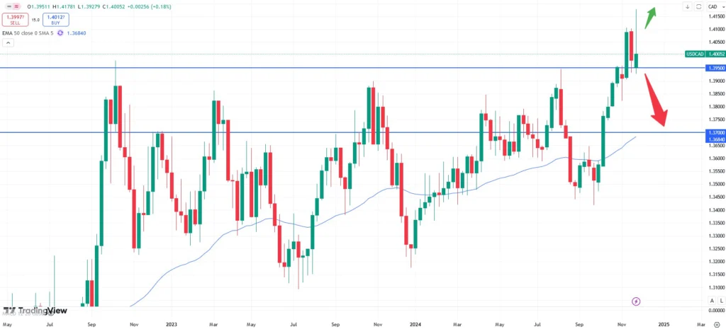 The USDCAD currency pair shows a strong retracement off the weekly chart above. This might indicate that the price of the Canadian is gearing up momentum, causing this pair to proceed lower. A potential target might be the area at 1.3700 as the long- term chart suggests. Only a break above the highs near the 1.4100 area might offer further upside potential again. The data will be published on Friday December 06 at 14:30 CET.