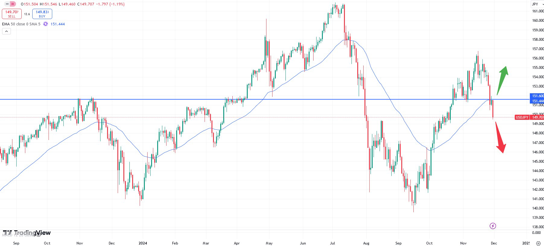In general, the USDJPY currency pair offers the most volatility in the trading hours after the news event. In this case the daily chart above shows potential into either direction. Yet, the price is currently trading below the 50- moving average, which also acts as a strong horizontal support zone. A bearish continuation might cause prices to fall further. The figure will be released on Friday December 06 at 14:30 CET.