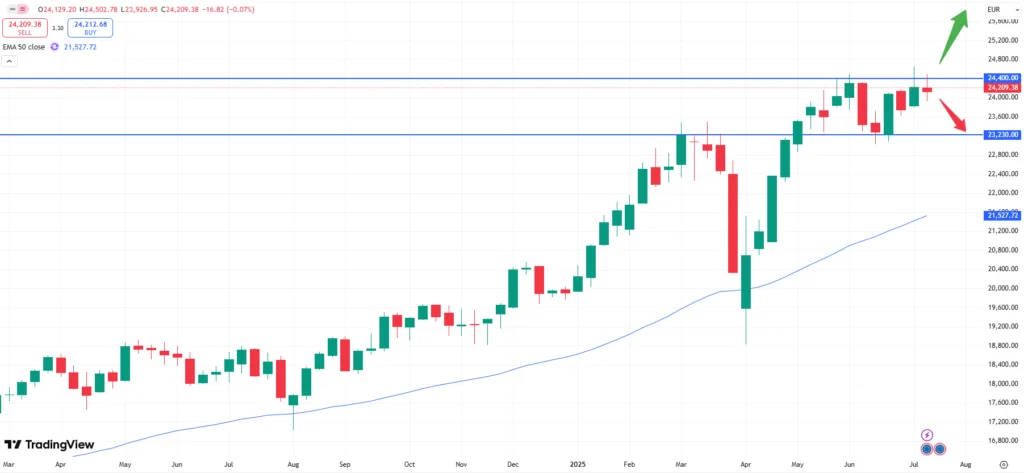 The DAX might be interesting in this case. Positive PMI data, in particular from Germany, could give the German stock index another boost. Higher prices even beyond the 24.400 level might ignite another push to the upside, while a correction towards the previous support zone at 23,230 could offer cheaper entry prices again. Both PMI data will be released on Thursday, 24th July at 09:15 CET and 09:30 CET respectively.