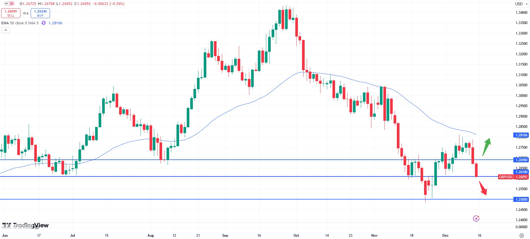 It seems that the support zone at that 1.2600 might be broken. This could hence open up room towards the next area at 1.2500. A potential wait- and- see approach by the FED could help to stabilise the Dollar, why the economic outlook in the UK still remains limited. A surprise rate- cut in the UK might also cause the Pound to weaken further. The interest rate decision will take place on Thursday, 19 December at 13:00 CET.