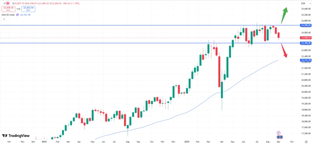 The DAX (GER40) index shows that the upside seems to remain limited. With the likelihood that US indices might correct also the DAX could weaken further. A break below the important zone of 23.300 points would indicate potential further losses A target could then be the 50- moving average, which currently sits at about 22,140 points. The news will be released on Thursday, 11th September at 14:15 CET.