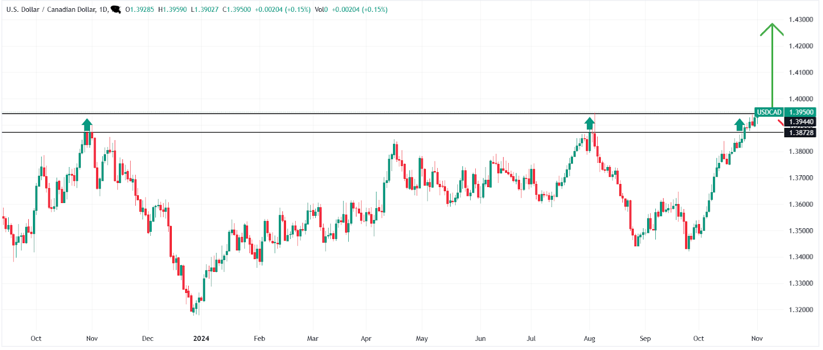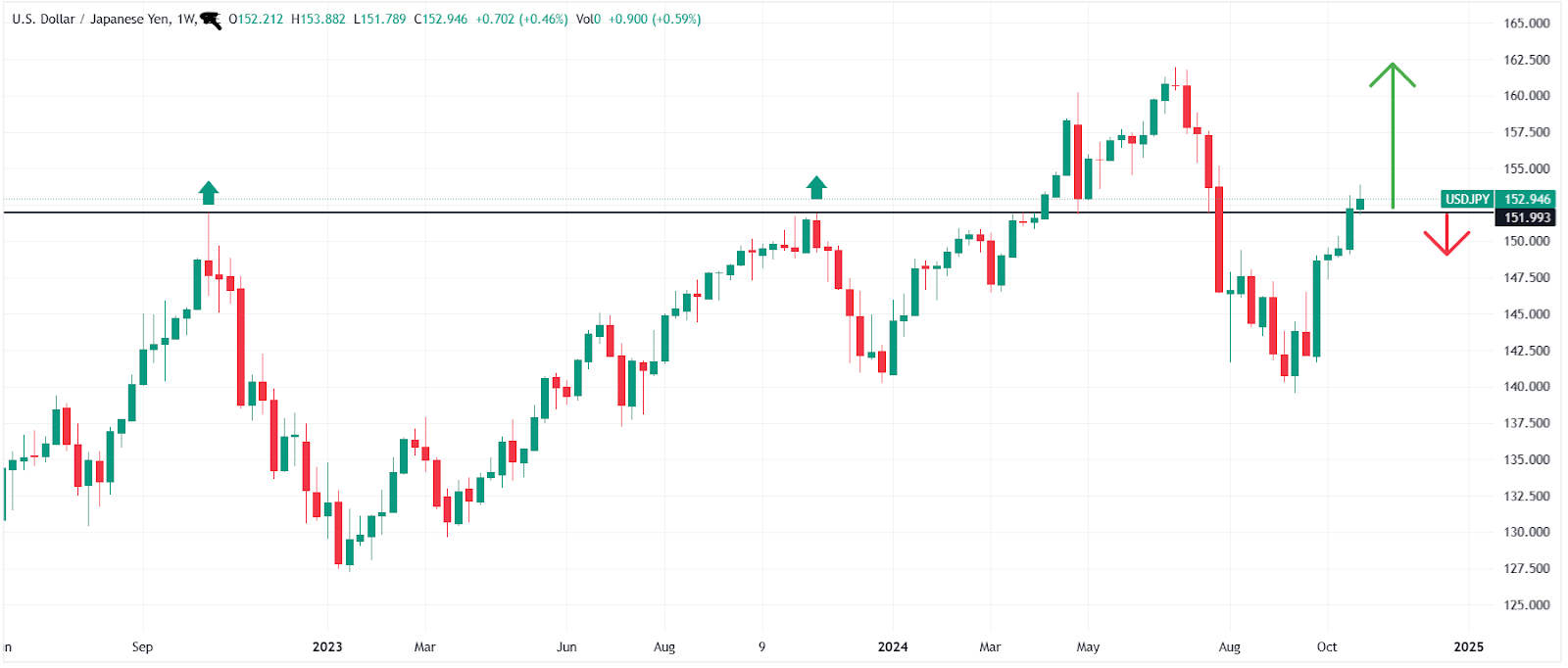 Last week, USDJPY continued its bullish trend, breaking resistance at 152.00 and currently trading around 153.00. Technical analysis suggests that if the breakout holds, USDJPY could target 162.00; conversely, a failure may lead to a drop to 149.10. Upcoming volatility will likely stem from the US election and the Fed’s rate decision.