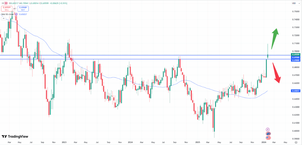 As the weekly chart above shows, the market has created a bearish pinbar candlestick pattern. This might indicate, that prices should be expected to fall, unless the market is able to break the 0.7050 resistance level. The bearish pressure might even intensify below the 0.6900 price level, which was a support zone several times in the past. Hence a retest of the 0.6700 level could be on the cards if the strength of the US- Dollar continues to gear up momentum. Due to the recent rise in inflation in Australia the Central Bank is expected to increase the interest rate again. This, in general, should be seen as positive but might only cause a small impact given the current circumstances. The data will be released on Tuesday, the 03rd of February at 04:30 CET.