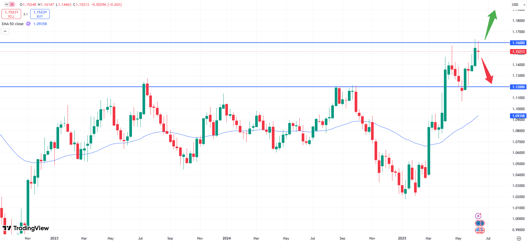 The weekly chart of the EURUSD currency pair shows a steady uptrend, which had emerged in March this year. Yet, after having tested higher levels, it seems that prices might not be able to break above the 1.1600 price zone for now. The slight strength of the Dollar might hence cap prices below that zone causing a potential push to the downside initially. Positive data, on the other hand, might cause the market to break above that zone. The purchasing manager index from the Germany will be published on the 23rd of June, 2025 at 09:30 CET.