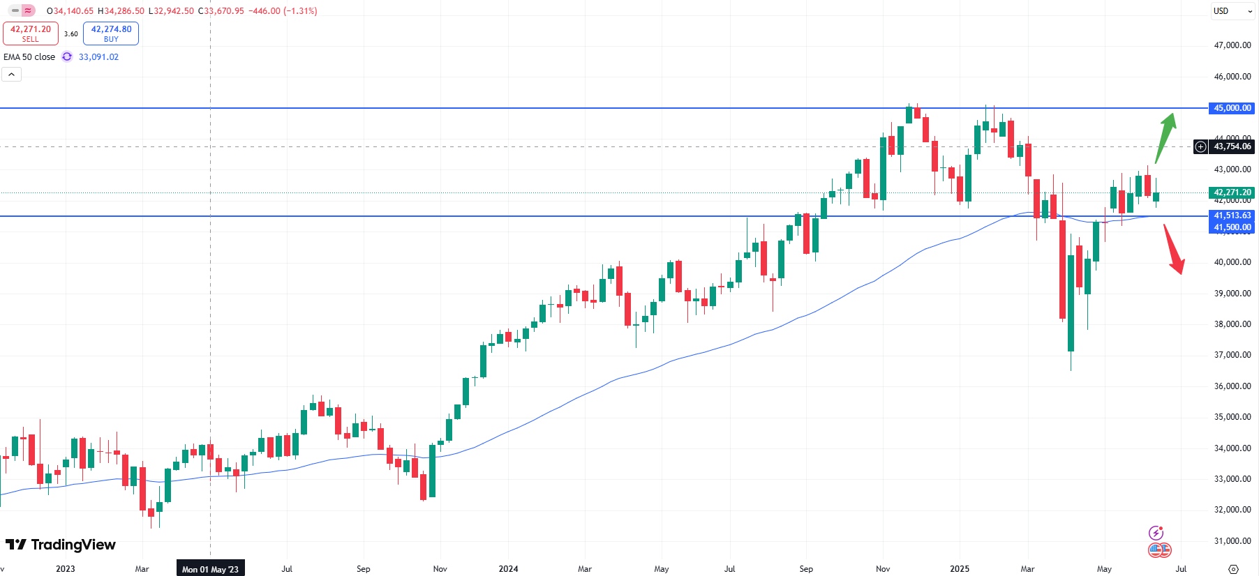 The Dow Jones industrial index continues to rise towards previous levels and might test the 45.000 zone soon. Yet, currently the positive momentum had stopped and prices started to fall again. A higher price index might be another reason for falling prices. The Fed might hence remain in their rather hawkish mode, which would harm fresh inflows into the stock markets. Vice versa falling prices, like we have observed last month, will indicate that the upside momentum could be due to continue. The data from the US will be released on the 27th of June, 2025 at 14:30 CET.
