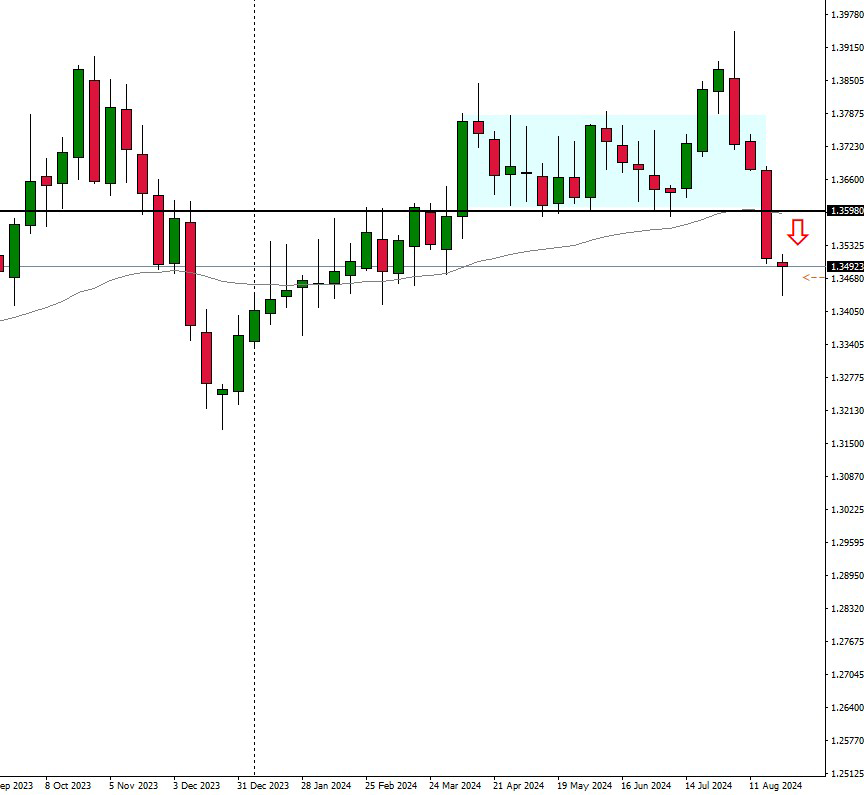 A look at the USDCAD currency pair now shows a clear downtrend. Any setback towards the resistance zone near the 1.3600 mark could offer fresh selling oportunities. In this case, new short positions might be taken. The decision will be made on Wednesday 04 September at 15:45 CET.