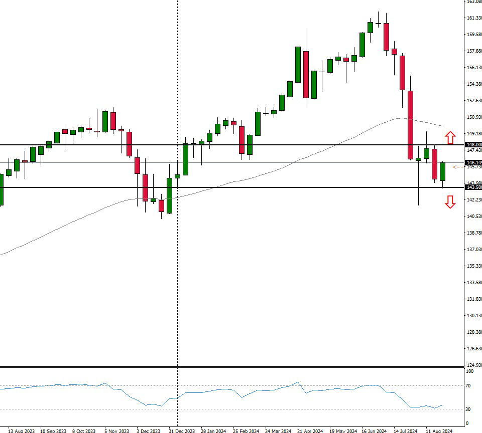 The weekly chart of the EURUSD currency pair indicates that the market appears to be moving downwards again at the important resistance level of 1.1200. This movement could continue in the coming trading days. This movement could continue in the coming trading days. Better-than-expected data in particular could underpin this trend and the Dollar could rise. However, should the market break through the important resistance, new potential towards the 1.1400 – 1.1500 zone could emerge. The figure will be released on Thursday the 5th of September at 14:15 CET.
