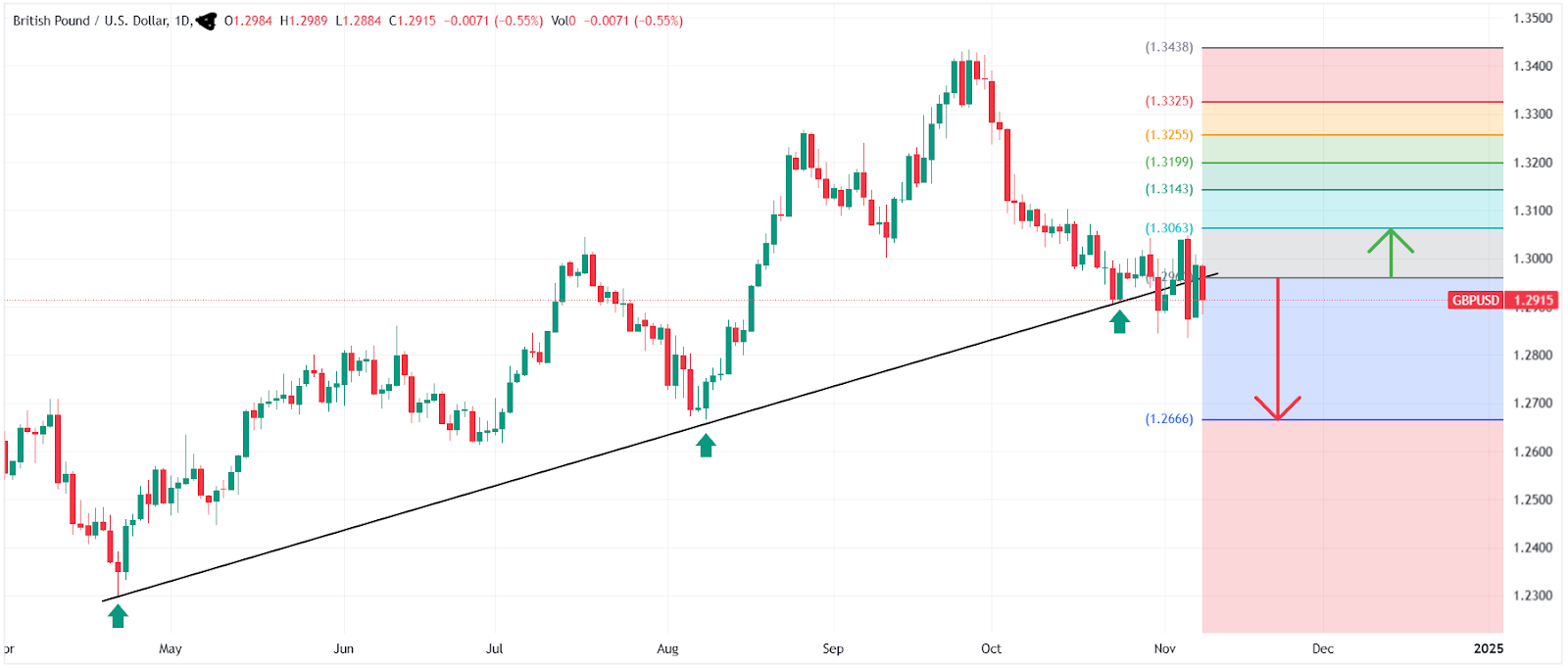 Last week, GBPUSD broke below its uptrend line on the daily chart at 1.2960, driven by the BoE and Fed rate cuts and Trump’s election win. If the downside breakout holds next week, the pair could target 1.2670, while a failed breakout may see a rally toward 1.3060, influenced by upcoming US CPI and UK GDP releases.