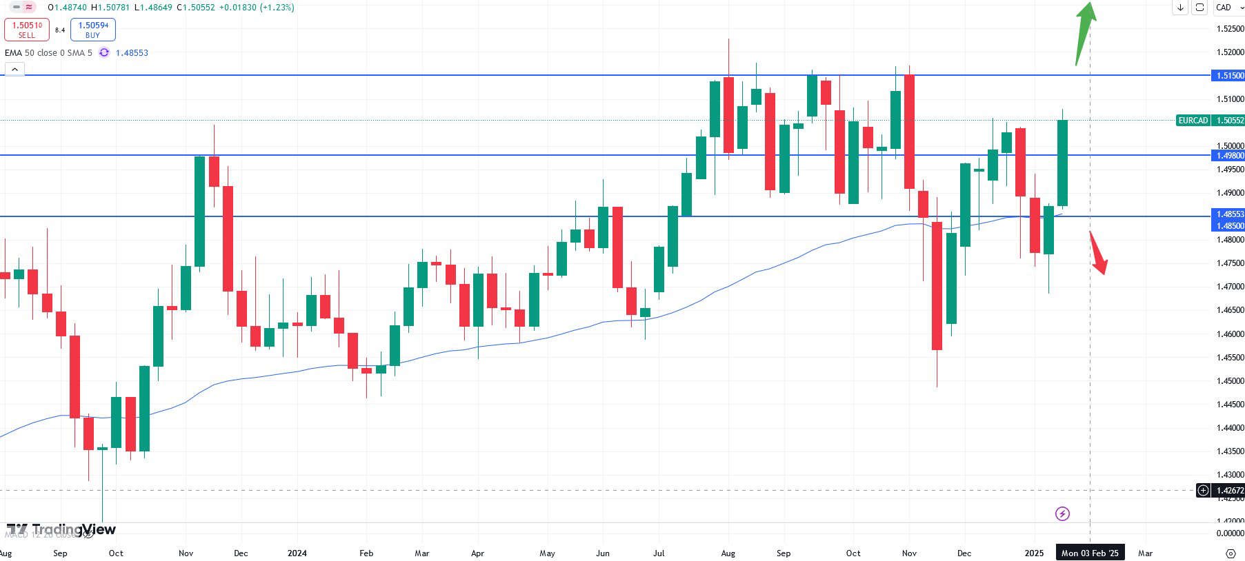 The weekly chart of the EURCAD currency pair shows, that more upside momentum might follow soon. The recent break of the psychological 1.5000 zone could unleash further upside potential as well. Since the 1.5150 zone being in reach a break might also ignite more upside momentum soon. Should the strength of the EUR continue now the 1.5150 area might also be tested soon. The interest rate decision from Canada will be held on the 29rd January, 2025, at 15:45 CET.