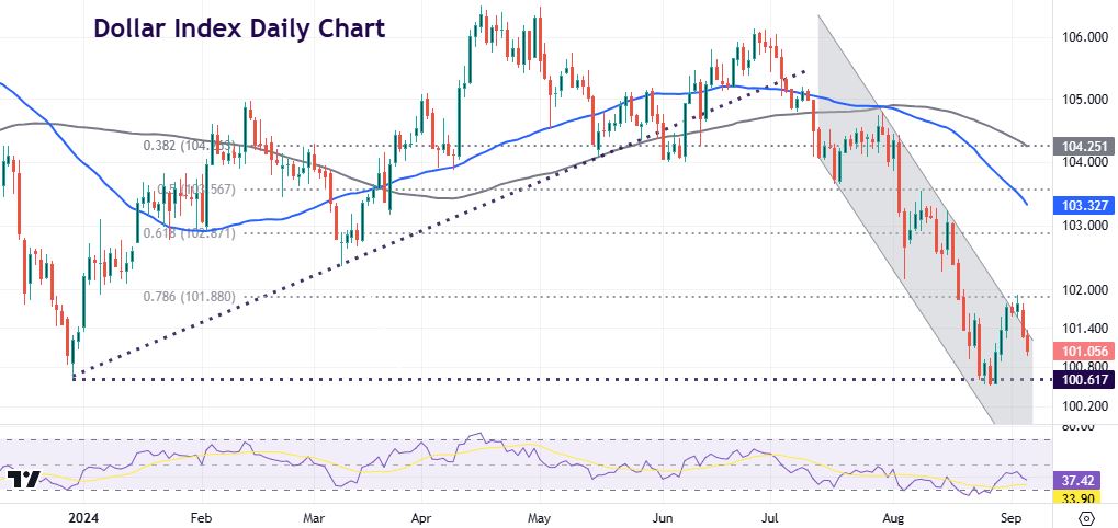 If we get a sub 100k on payrolls and the unemployment rate ticks up to 4.4% or even 4.5% then 50bps looks more likely given Powell’s recent comment that “we don’t seek or welcome further cooling in labour market conditions”. This should hurt USD while rekindling recession fears. However, if payrolls come in around the 150k mark and unemployment rate stays at 4.3% or dips to 4.2%, as the consensus is currently predicting, a 25bps is much more likely. There’s 110 bps of cuts priced in to the next three meetings.