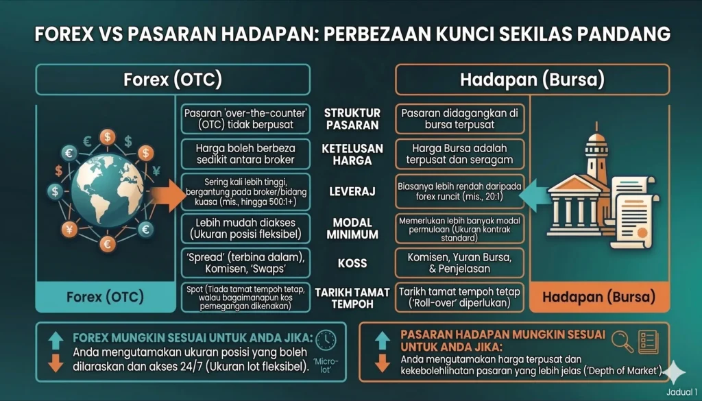 | Aspek | Dagangan Forex | Dagangan Futures |