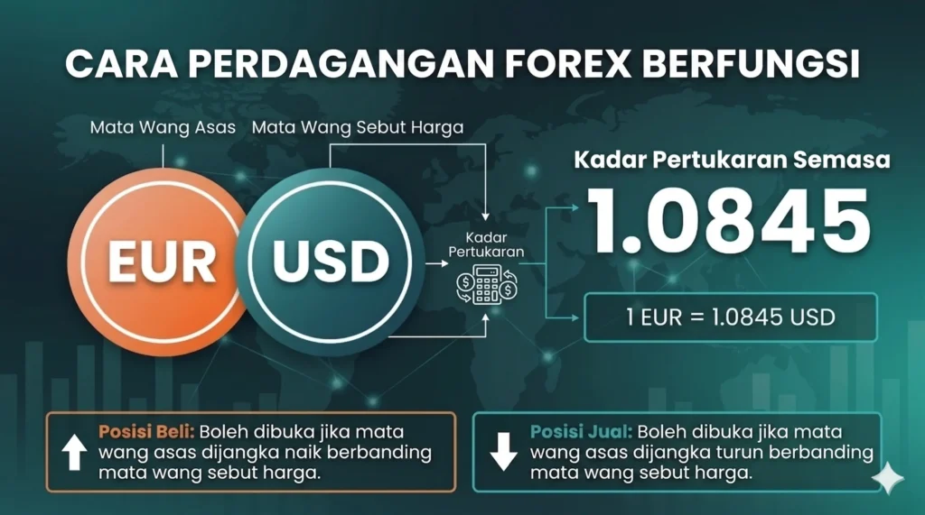 Secara mudah, dagangan forex bermaksud menukar satu mata wang kepada mata wang yang lain. Ini dilakukan melalui pasangan mata wang seperti EUR/USD atau GBP/USD. Mata wang pertama dipanggil mata wang asas, manakala mata wang kedua dipanggil mata wang sebut harga.