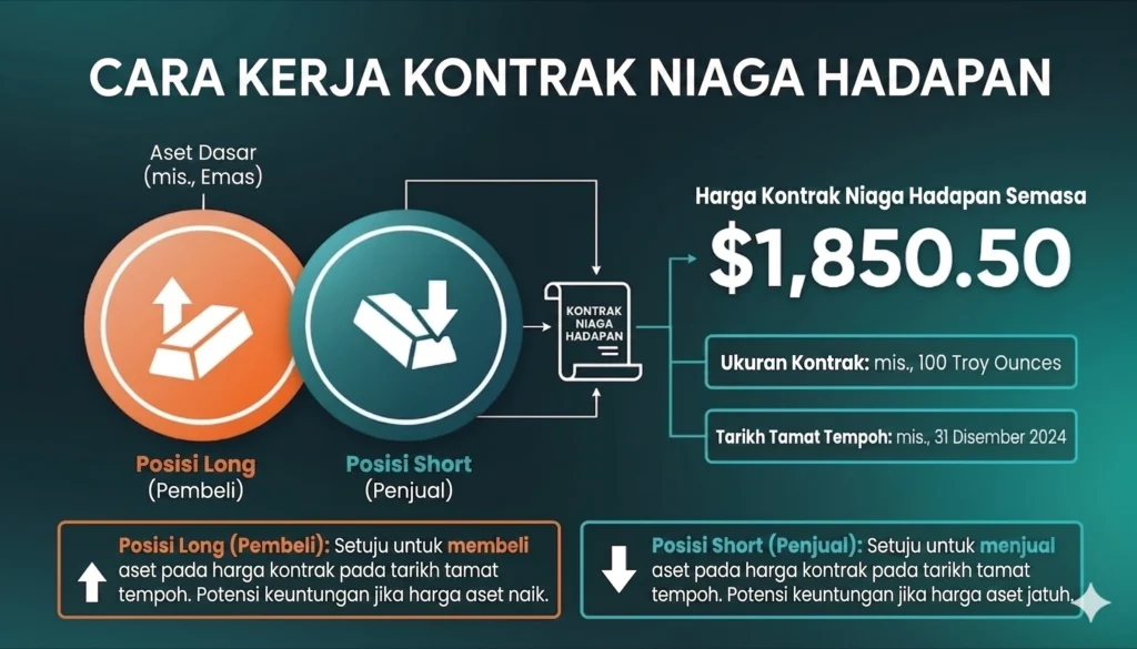 Dagangan futures melibatkan pembelian atau penjualan kontrak standard yang berasaskan aset pendasar. Aset itu boleh berupa mata wang, komoditi, indeks, bon atau instrumen kewangan lain. Kontrak futures menetapkan harga dagangan lebih awal, manakala kontrak itu sendiri berkait dengan tarikh penyelesaian pada masa hadapan.