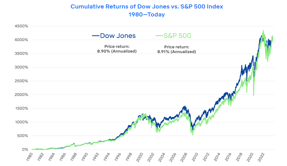 Contohnya, dalam jangka panjang, prestasi DJIA hampir setanding dengan S&P 500, masing-masing mencatat pulangan tahunan sekitar 8.9%.